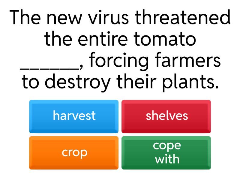 1) The new virus threatened the entire tomato ______, forcing farmers to destroy their plants. a) harvest b) shelves c) crop d) cope with 2) Due to the war, there is a severe ______ of wheat in the country. a) crop b) shortage c) shelves d) harvest 3) Modern agriculture often relies on ______ to protect plants, but this can harm the environment. a) insecticides b) shortage c) harvest d) crop 4) After three months of hard work, it was finally time for the ______. a) cope with b) shortage c) harvest d) shelves 5) Many people in the region suffer from ______ due to poverty and limited access to diverse foods. a) insecticides b) ran out of c) crop d) undernourishment 6) The supermarket ______ were empty after people heard about the coming storm. a) harvest b) shelves c) crop d) cope with 7) Farmers had to learn to ______ the increasingly unpredictable weather. a) harvest b) shelves c) ran out of d) cope with 8) We had to stop painting the fence because we ______ paint. a) crop b) cope with c) shelves d) ran out of
