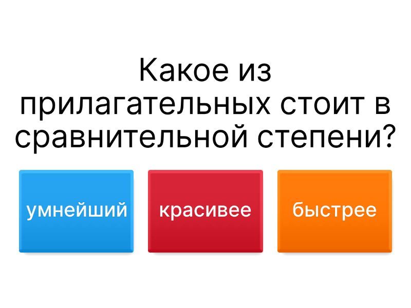 1) Какое из прилагательных стоит в сравнительной степени?  a) умнейший b) красивее c) быстрее 2) С помощью каких суффиксов образуется сравнительная степень прилагательных? С помощью каких суффиксов образуется сравнительная степень прилагательных? a) -ее b) -онн, -енн c) -айш, -ейш 3) В каком ряду все прилага a) более быстрый, быстрее b) умней, менее умный c) веселей, острее 4) Чем в предложении являются прилагательные в форме простой сравнительной степени? a) определением b) сказуемым c) дополнением 5) Что показывает прилагательное в форме превосходной степени? a) Сравниваются 2 предмета b) один предмет сравнивается с другим c) предмет превосходит все остальные по какому-то предмету
