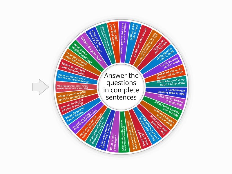 How do you spell the name of your favorite singer/band/group?, Where do you feel most comfortable?, How do you spell your last name?, What is your neighborhood like?, Where do you live?, What is your favorite TV show?, What do you do? Where are you at the moment ? What are you doing?, Can you spell your first name?, When do you read books/articles/emails/blogs?, Who is your best friend?, When were you born?, What are your favourite clothes? What are you wearing now? , What is your family like?, What is your favorite food?, What is your favorite sport?, What do you usually do on the weekend?, What do you often do in your free time?, Who is your favorite actress/actor?, What kind of movies do you like?, What is your favorite drink? Why?, What are your children's names?, Can you spell your pet's name?, What is your favorite part of the city? Why?, When do you watch TV?, When do you listen to music? What music do you prefer?, Which room in your flat or house is your favourite and why? , What is your profession? , Do you have a favorite English word or expression?, What three adjectives describe you best?, What was the last TV show you binge-watched?, Everybody: say 3 things you always do in your daily routine., When do you do house chores?, How often do you do your laundry?, What is your favorite sport to watch/play?, What restaurant or street vendor can you recommend in your city?.