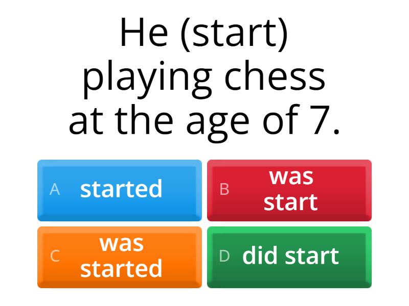 1) He (start) playing chess at the age of 7. a) started b) was start c) was started d) did start 2) I (find) my true love when I was 50. a) finded b) found c) was find d) did find 3) _____ you at the stadium yesterday?' 'Yes, I_______ a) Were / was b) did / did c) did / was d) Did you be / did 4) I (not see) Peter at the theater last week. a) don't see b) didn't saw c) wasn't see d) didn't see 5) I (make) a lot of mistakes during the match. a) maked b) did made c) made d) didn't made 6) Somebody (eat) my biscuits without telling me. a) eated b) ate c) was eat d) eaten 7) ________ to the beach last Sunday? a) Were you go b) Was you go c) Did you went d) Did you go 8) The weather is nice today, but it _____ horrible last weekend. a) was b) were c) did d) did be 9) We (buy) this sofa in the shop at the end of the street. a) buyed b) bought c) were buy d) were bought 10) _________ this sofa in the shop at the end of the street? a) Did you bought b) Were you bought c) Did you buy d) Were you buy