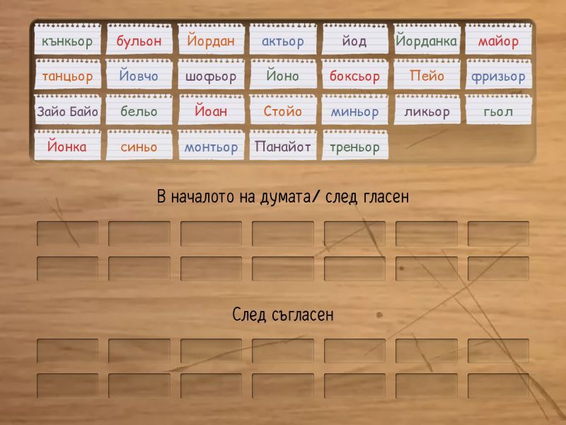 В началото на думата/ след гласен: йод, майор, Йоан, Йоно, Зайо Байо, Йордан, Йорданка, Панайот, Стойо, Пейо, Йонка, Йовчо, След съгласен: гьол, синьо, бельо, бульон, миньор, актьор, шофьор, монтьор, боксьор, треньор, ликьор, фризьор, кънкьор, танцьор,