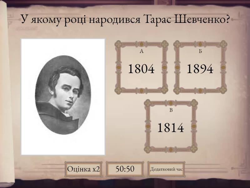 1) У якому році народився Тарас Шевченко? a) 1804 b) 1894 c) 1814 2) День та місяць народження Тараса Шевченко a) 8 березня b) 9 березня c) 10 березня 3) Тарас Шевченко народився a) кріпаком b) вільною людиною 4) Скільки йому було років коли померла його мати? a) 8 b) 9 c) 10 d) 11 e) 12 f) 13 5) Який талант був з дитинства у Тараса? a) співати b) малювати c) рахувати 6) Слово плекають означає? a) сумують b) турбуються c) плетуть 7) Доповни рядок вірша. "Тихесенько вітер віє, степи, лани ..." a) засинають b) мріють 8) Доповни рядок вірша. " Любо, любо стало, пташечка зраділа і ... a) полетіла b) заспівала c) защебетала 9) Слова з вірша Тараса Шевченка "край неба палає" вжито a) у прямому значенні b) у переносному значенні 10) Де народився Тарас Шевченко? a) село Моринці b) село Мотовилівка c) село Михайлівка