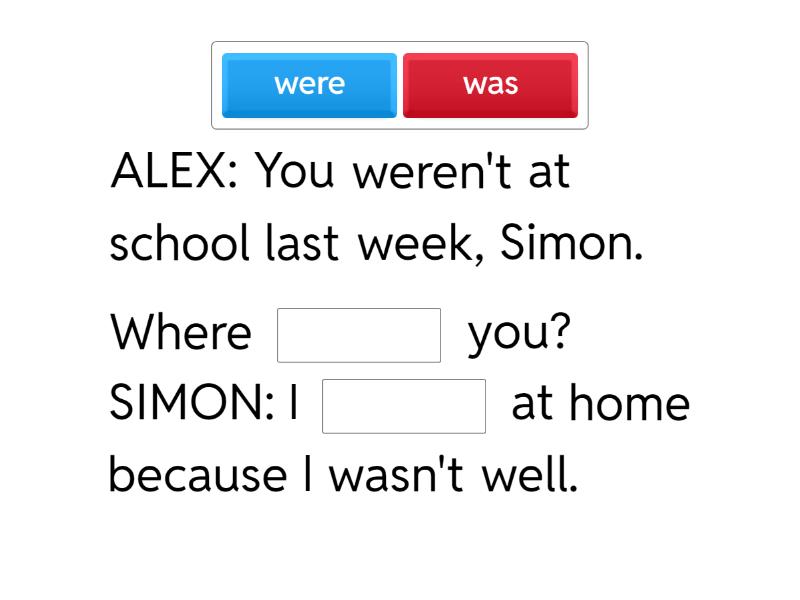 ALEX: You weren't at school last week, Simon. Where ____ you? SIMON: I ____ at home because I wasn't well. ALEX: What was the ____? SIMON: I was ____. Last Monday I had a ____. It was 39º. ALEX: Wow! ____ was the matter? SIMON: I don't know. I ____ lots of water, but on Tuesday I was worse and I had a bad ____ too. ALEX: Were you ____ on Wednesday? SIMON: No, I wasn't. I had a ____ cough so I saw the doctor. He gave me some ____. ALEX: Were you better after you ____ the medicine? SIMON: No, I wasn't. On Thursday I ____ to the hospital with Mum and ____ some tests. ALEX: So, ____ was the matter? SIMON: Er, I had a ____ … but I wasn't ill on Friday afternoon. I ____ fine! I ____ a big dinner … and then I had a really good weekend!