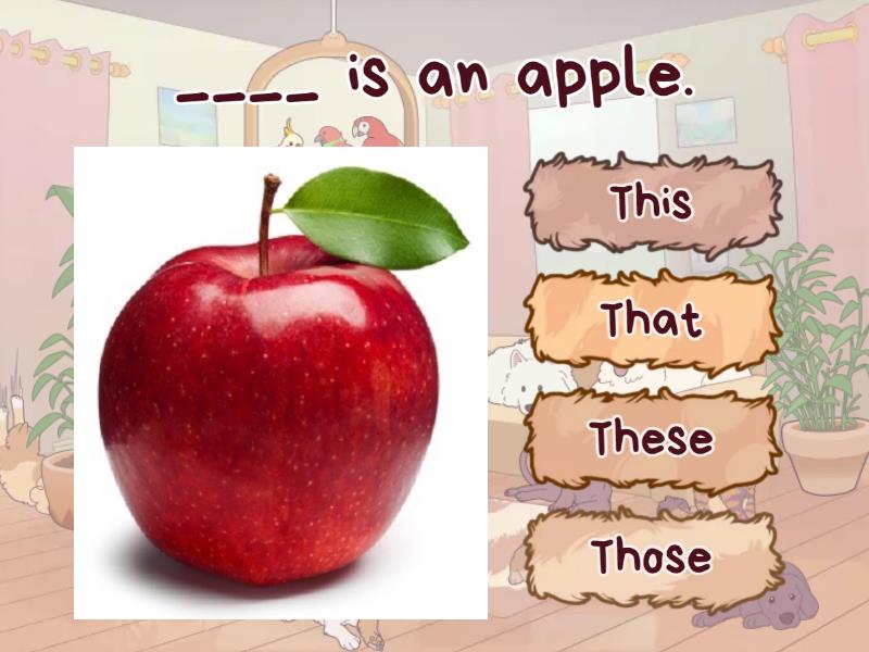 1) ____ is an apple. a) This b) That c) These d) Those 2) _____ are books. a) This b) That c) These d) Those 3) This is a white musical box and ____ is a blue musical box. a) that b) those c) these 4) _____ are trains a) This b) That c) Those 5) _____ is a black horse. a) That b) These c) Those 6) _____ are elephants. a) This b) That c) Those 7) ____ are boxes. a) This b) That c) These 8) _____ is a yellow dress. a) This b) That c) These d) Those 9) ____ is a brown chair. a) This b) That c) These d) Those 10) _____ is a big white house. a) That b) These c) Those 11) What colour are ____ dogs? a) this b) that c) these