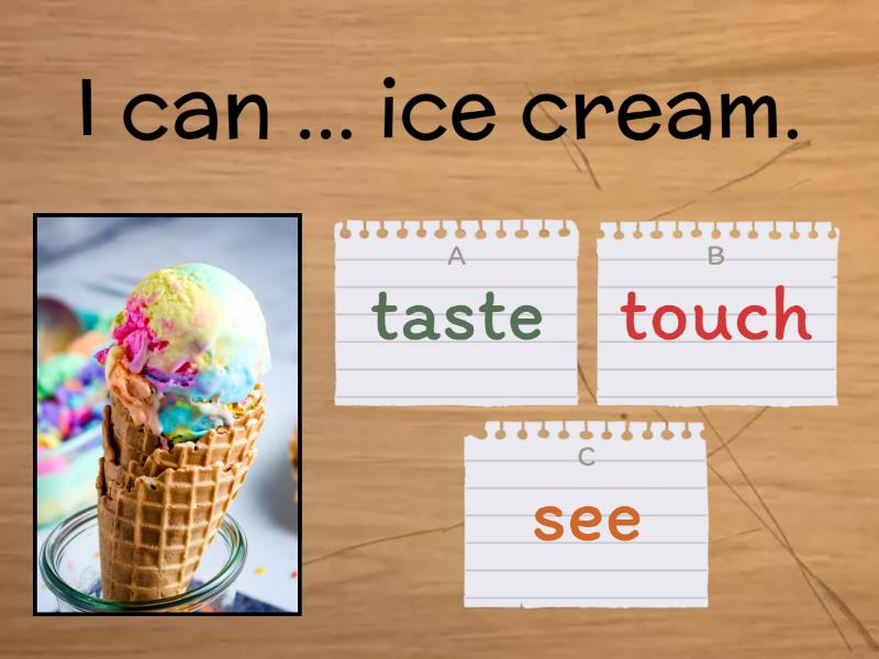 1) I can ... ice cream. a) taste b) touch c) see 2) I can ... birds in the tree. a) see b) taste c) smell 3) I can ... a table. a) touch b) taste c) smell 4) I can ... flowers. a) taste b) smell c) hear 5) I can ... music. a) hear b) smell c) taste 6) I can ... pizza. a) see b) taste c) hear 7) I can ... the moon. a) see b) taste c) smell 8) I can ... a plane up in the sky. a) hear b) touch c) smell 9) I can ... smoke. a) smell b) taste c) touch 10) I can ... a cat. a) touch b) smell c) taste 11) I can ... the piano. a) smell b) taste c) hear 12) I can ... the rainbow. a) see b) touch c) hear 13) I can ... a lemon. a) taste b) touch c) see 14) I can ...  my dog. a) taste b) touch c) smell