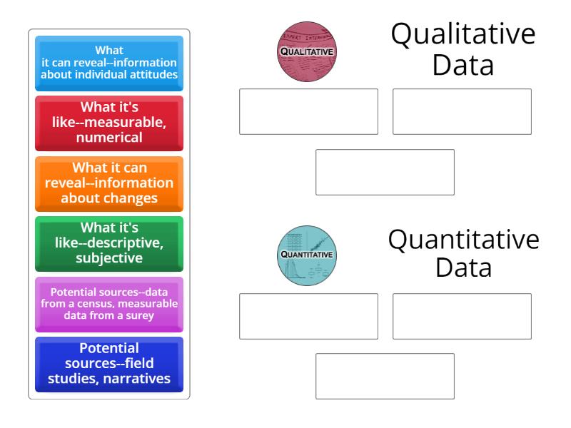 Qualitative Data: Potential sources--field studies, narratives, What it's like--descriptive, subjective, What it can reveal--information about individual attitudes, Quantitative Data: Potential sources--data from a census, measurable data from a surey, What it's like--measurable, numerical, What it can reveal--information about changes ,