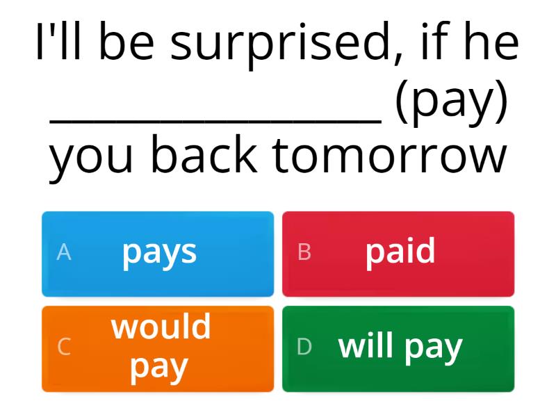 1) I'll be surprised, if he _______________ (pay) you back tomorrow a) pays b) paid c) would pay d) will pay 2) If I were you, I _____________(not go) to Alaska in the winter. a) won't go b) wouldn't go c) didn't go d) don't go 3) What ____________________ (you/do) if you saw a mouse in your bed? a) will you do b) did you do c) would you do d) can you do 4) If I don't see you this evening, I __________________________(see) you on Friday a) would see b) saw c) didn't see d) 'll see 5) Where will we go tomorrow if it_____________(rain)? a) rained b) will rain c) rains d) would rain 6) She'd pass the exams, if she ____________ (study) harder a) studied b) will study c) would study d) studies 7) If you asked her nicely, she _____________________ (lend) you the money a) will lend b) would lend c) lends d) lent 8) If you ____________________(not hurry up), we'll miss the train a) didn't hurry up b) wouldn't hurry up c) won't hurry up d) don't hurry up