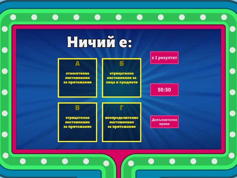 1) Ничий е: a) относително местоимение за притежание b) отрицателно местоимение за лица и предмети c) отрицателно местоимение за притежание d) неопределително местоимение за притежание 2) Нечий е: a) относително местоимение за притежание b) отрицателно местоимение за лица и предмети c) отрицателно местоимение за притежание d) неопределително местоимение за притежание 3) Колко са местоименията в изречението? Възпитаният човек никога няма да обиди хората около себе си. a) едно b) две c) три d) няма нито едно 4) Кое вярното твърдение за изречението? Не забравяйте, че всеки край е старт на някакво начало. a) В изречението е употребено само обобщително местоимение. b) В изречението е употребено само неопределително местоимение. c) В изречението има две местоимения в роля на допълнение. d) В изречението има две местоимения в роля на определение. 5) На кой ред е нарушено съгласуването? a) Момичето, чиито очи ме плениха днес, днес гледа тъжно. b) Не започвайте работа, чийто край не е във вашите ръце. c) Опитът е учител, чиито уроци са най-ценни. d) Уважавам само хората, чийто дела се покриват с думите. 6) Колкото е: a) отрицателно местоимение за количество b) относително местоимение за количество c) показателно местоимение за количество d) въпросително местоимение за количество 7) В кое изречение въпросителното местоимение е употребено с правилна форма? a) На кой са тези моливи? b) От кого да очаквам съдействие? c) Ще разбера чий приятели са помогнали. d) На кому е този красив кон? 8) В кое изречение е допусната пунктуационна грешка? a) Ученикът се интересуваше какво е комета, коя е тази планета. b) Те получиха толкова от мен, колкото от теб. c) Не прави днес това, за което ще съжаляваш утре. d) Журито награди ученика чийто разказ се класира на първо място.