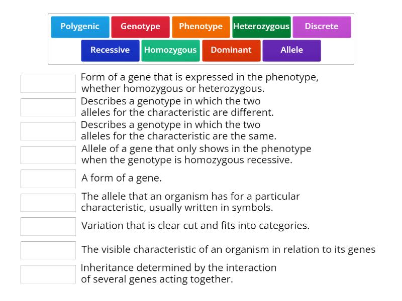 Allele - A form of a gene., Discrete - Variation that is clear cut and fits into categories. , Dominant - Form of a gene that is expressed in the phenotype, whether homozygous or heterozygous., Genotype - The allele that an organism has for a particular characteristic, usually written in symbols., Heterozygous - Describes a genotype in which the two alleles for the characteristic are different., Homozygous - Describes a genotype in which the two alleles for the characteristic are the same., Phenotype - The visible characteristic of an organism in relation to its genes, Polygenic - Inheritance determined by the interaction of several genes acting together., Recessive - Allele of a gene that only shows in the phenotype when the genotype is homozygous recessive. ,