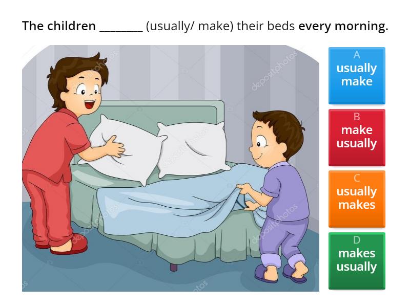 1) The children ________ (usually/ make) their beds every morning. a) usually make b) make usually c) usually makes d) makes usually 2) I ________ (usually/ go) swimming on Monday mornings. a) usually go b) usually goes c) go usually d) goes usually e) am usually going 3) The girls _______ (swim) in a competition this week. a) swim b) are swimming c) swims d) is swimming 4) She _________ (always/play) basketball on Tuesdays. a) play always b) plays always c) always plays d) always play e) is always playing 5) They ________ (meet) on Saturday to plan the party. a) meet b) are meeting c) is meeting d) meets 6) He _______ (never/ have) breakfast in the morning. a) has never b) have never c) never have d) never has e) is never having 7) She _______ (play) football this Saturday afternoon. a) is playing b) playing c) play d) plays 8) They ________ (meet) with their teacher once a month. a) meets b) are meeting c) is meeting d) meet 9) I __________ (hardly ever/ do) my homework in the evening. a) hardly ever does b) do hardly ever c) does hardly ever d) hardly ever do e) am hardly ever doing 10) Anne and Michael ________ (fly) to Morocco this weekend. a) fly b) are flying c) flies d) is flying 11) Tom and Juliette _________ (go) to the cinema on Friday. a) is going b) goes c) go d) are going 12) Jack _______ (always/ have) dinner with his family in the evenings. a) always have b) always has c) has always d) is always having 13) We ______ (have) volleyball practice on Monday evenings. a) have b) has c) are having 14) I ________ (never/be) late for work. a) never b) never am c) am never