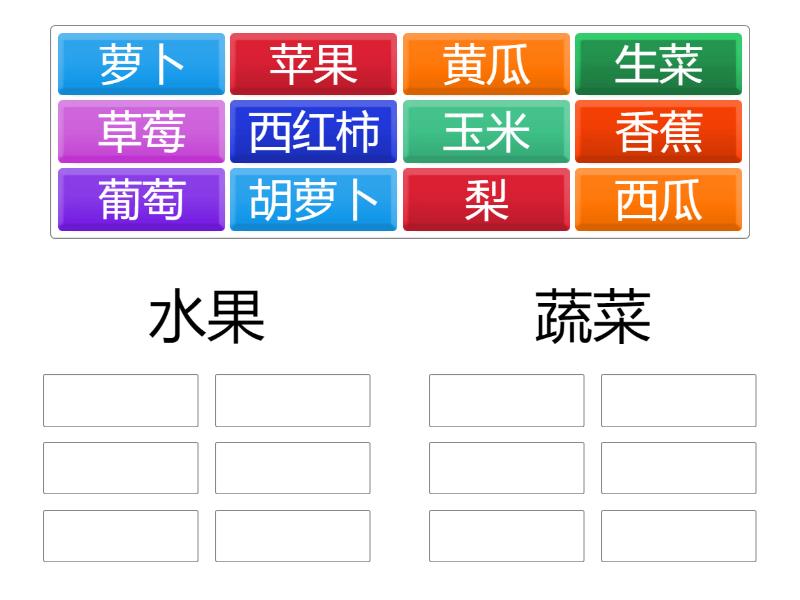 水果: 苹果, 梨, 香蕉, 草莓, 西瓜, 葡萄, 蔬菜: 萝卜, 胡萝卜, 玉米, 黄瓜, 生菜, 西红柿,