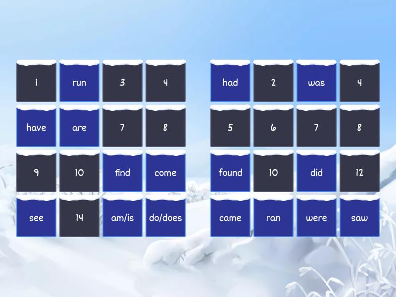 am/is - was, are - were, see - saw, find - found, run - ran, do/does - did, come - came, have - had, can - could, tell - told, go - went, hide - hid, fall - fell, think - thought, meet - met, know - knew,