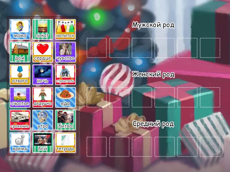 Мужской род: дедушка, бой, напиток, строитель, закат, дом, Женский род: тетрадь, отвага, еда, мама, ночь, битва, Средний род: сердце, счастье, время, чувство, утро, сражение,