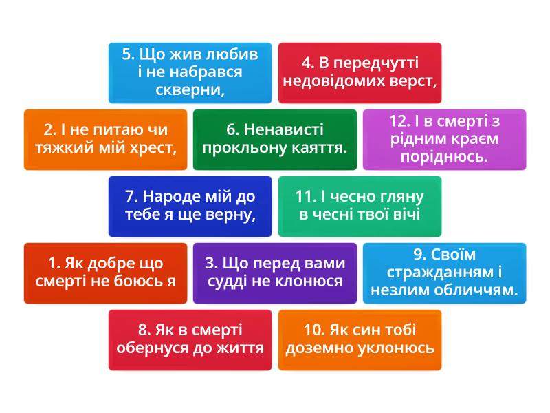 1. Як добре що смерті не боюсь я - Як добре, що смерті не боюсь я, 2. І не питаю чи тяжкий мій хрест, - І не питаю, чи тяжкий мій хрест,, 3. Що перед вами судді не клонюся - Що перед вами, судді, не клонюся, 4. В передчутті недовідомих верст, - В передчуті недовідомих верст,, 5. Що жив любив і не набрався скверни, - Що жив, любив і не набрався скверни,, 6. Ненависті прокльону каяття. - Ненависті, прокльону, каяття., 7. Народе мій до тебе я ще верну, - Народе мій, до тебе я ще верну,, 8. Як в смерті обернуся до життя - Як в смерті обернуся до життя, 9. Своїм стражданням і незлим обличчям. - Своїм стражданням і незлим обличчям., 10. Як син тобі доземно уклонюсь - Як син, тобі доземно уклонюсь, 11. І чесно гляну в чесні твої вічі - І чесно гляну в чесні твої вічі, 12. І в смерті з рідним краєм поріднюсь. - І в смерті з рідним краєм поріднюсь.,