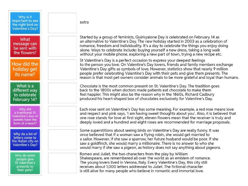 Why did a traditional St Valentine’s box of sweets have the form of a heart? - Chocolate is the most common present on St. Valentine’s Day. The tradition goes back to the 1800s when doctors made patients eat chocolate to make them feel happier. This might also be the reason why in the 1860s, Richard Cadbury produced his heart-shaped box of chocolates exclusively for Valentine’s Day., Why do some people give St Valentine’s presents to their pets? - St Valentine’s Day is a perfect occasion to express your deepest feelings to the person you love. On Valentine's Day lovers, friends and family members exchange Valentine’s Day gifts as symbols of love. However, statistics show that nearly 9 million people prefer celebrating Valentine’s Day with their pets and give them presents. The reason is that most pet owners consider animals to be more grateful and loyal than humans., What message can be sent with the flowers? - Each rose sent on Valentine’s Day has some meaning. For example, a red rose means love and respect and pink says, ‘I am having sweet thoughts about you’. Also, it is believed that one rose stands for love at first sight, eleven flowers mean that the receiver is truly and deeply loved and a hundred and eight roses are recommended for marriage proposals., Why is it important to see the right bird on Valentine’s Day? - Some superstitions about seeing birds on Valentine’s Day are really funny. It was once believed that if a woman saw a flying robin, she would get married to a sailor. However, if she saw a sparrow, her future husband would be poor. If she saw a goldfinch, she would marry a millionaire. There is no answer to who she would marry if she saw a pigeon, as history does not say anything about pigeons., Why do a lot of letters come to the Italian city on Valentine’s Day? - Romeo and Juliet, the two characters from the play by William Shakespeare, are remembered all over the world as an emblem of romance. The young lovers lived in Verona, Italy. Every Valentine’s Day, this city still receives about 1,000 letters addressed to Juliet. The fictional character is still alive for many people who believe in romantic and immortal love., What is a different way to celebrate February 14? - Started by a group of feminists, Quirkyalone Day is celebrated on February 14 as an alternative to Valentine’s Day. The new holiday started in 2003 as a celebration of romance, freedom and individuality. It’s a day to celebrate the things you enjoy doing alone. Ways to celebrate include: buying yourself a new dress, taking a long walk without your mobile phone, exploring a new part of town, trying a new recipe etc., How did the holiday get its name? - extra,