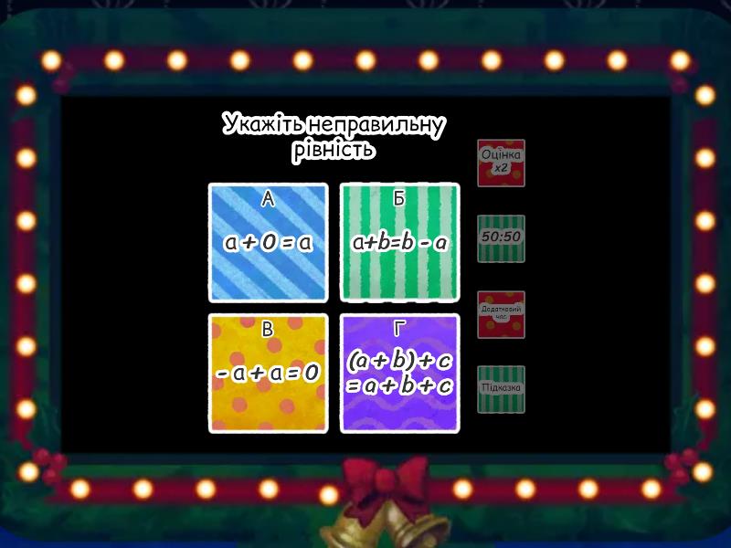 1) Укажіть неправильну рівність a) а + 0 = а b) а+b=b - a c) - а + а = 0 d) (a + b) + c = a + b + c 2) Застосуй переставну властивість додавання до виразу -5 + 7 =... a) -5 - 7 b) 7 + (- 5) c) -7 - 5 d) 7- (-5) 3) Застосуй сполучну властивість додавання до виразу (- 3 + 73) + 7=... a) -3 + 73 + 7 b) -3 + (73 + 7) c) 7 + (-3 + 73) 4) Чому дорівнює сума протилежних чисел? a) сумі їх модулів b) нулю c) другому доданку d) першому доданку 5) Знайдіть суму а + ( -а) + а =.... a) 3а b) -2а c) -а d) а 6) Знайди суму всіх цілих чисел, що розміщені на координатній прямій між числами -5,1 і 3,7 a) -4 b) -9 c) -5 d) 9 7) Виконайте додавання зручним способом -13,6 + (-15,333) +(-6,4)+(-4, 667) = a) -20,01 b) -40 c) -39, 9 d) -20,1 8) Обчисліть -1,5 + (-2,5) + (-3,7)=.... a) -7,7 b) -7 c) -6,7 d) -6 9) 5 +(- 9) = a) 4 b) 14 c) -4 d) -14 10) Сума чисел -21,4 і -10 дорівнює a) 31,4 b) -31,4 c) 21,4 d) -21,4 11) - 8 + (-11,2) = a) - 20 b) - 3,2 c) - 19,2 d) 12 12) Додайте -0,25 і 0,75 a) 0,5 b) 1 c) -1 d) -2 13) 2,7 + (- 7,9) =.... a) 5,2 b) 10,6 c) - 5,2 d) - 10,6 14) - 28,7 + 28,7 =.... a) 57,4 b) -56,7 c) - 57,4 d) 0 15) - 6,5 +11,5 =..... a) 5 b) 19 c) - 19 d) - 5 16) - 60 + 47 + ( - 37) = a) 70 b) - 50 c) 50 d) - 144 17) Яке з чисел є коренем рівняння 35+х=20? a) 15 b) -15 c) 55 d) -55 18) - 20,5 + (-7,5) + 20,5 + (- 2,5) +6 =.... a) - 4 b) 6 c) -14 d) 0