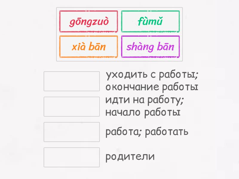 fùmǔ - родители, gōngzuò - работа; работать, shàng bān - идти на работу; начало работы, xià bān - уходить с работы; окончание работы,