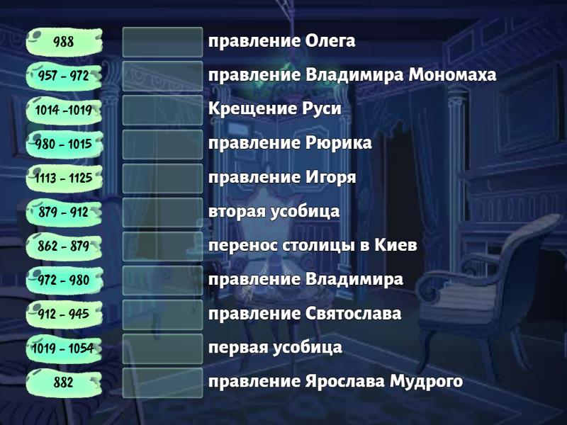 862 - 879 - правление Рюрика, 879 - 912 - правление Олега, 912 - 945 - правление Игоря, 957 - 972 - правление Святослава, 980 - 1015 - правление Владимира, 972 - 980 - первая усобица, 1014 -1019 - вторая усобица, 1019 - 1054 - правление Ярослава Мудрого, 1113 - 1125 - правление Владимира Мономаха, 988 - Крещение Руси, 882 - перенос столицы в Киев,