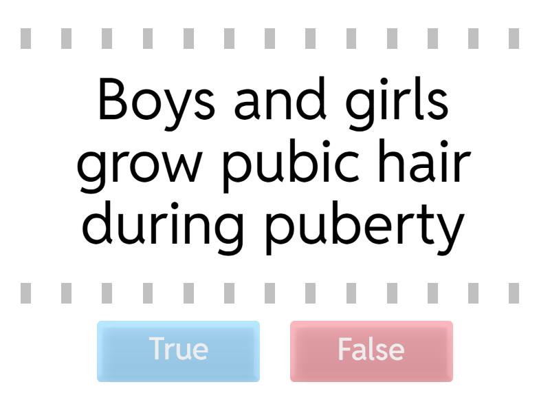 True: Boys and girls grow pubic hair during puberty , Girls hips widen during puberty , Puberty is controlled by hormones , Ovaries release an egg , Testes and penis gets bigger , Girls begin to develop breasts , False: Only boys begin to grow pubic hair during puberty, Puberty is controlled by the weather , Boys and girls both get a deeper voice during puberty , Testes start releasing an egg , Puberty in controlled by gametes , Only boys get taller during puberty,