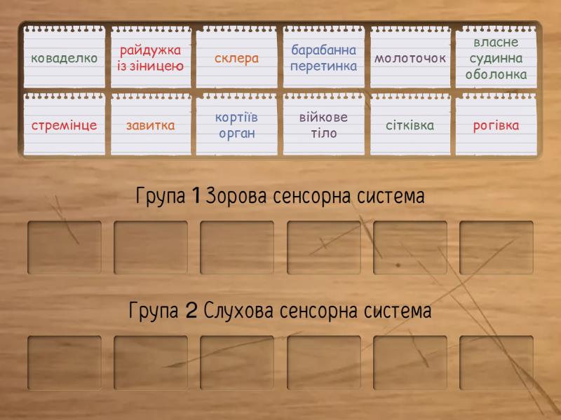 Група 1 Зорова сенсорна система: склера, рогівка, власне судинна оболонка, райдужка із зіницею, війкове тіло, сітківка, Група 2 Слухова сенсорна система: барабанна перетинка, молоточок, коваделко, стремінце, завитка, кортіїв орган,