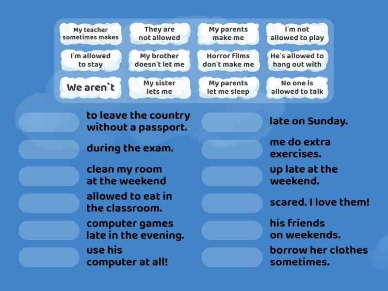 My parents make me - clean my room at the weekend, My sister lets me - borrow her clothes sometimes., I’m allowed to stay - up late at the weekend., They are not allowed - to leave the country without a passport., My brother doesn’t let me - use his computer at all!, Horror films don’t make me - scared. I love them!, He’s allowed to hang out with - his friends on weekends., I’m not allowed to play - computer games late in the evening., My teacher sometimes makes - me do extra exercises., No one is allowed to talk - during the exam., We aren`t - allowed to eat in the classroom., My parents let me sleep - late on Sunday.,