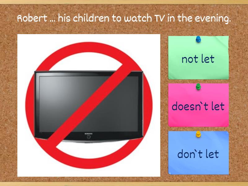 1) Robert ... his children to watch TV in the evening. a) not let b) doesn`t let c) don`t let 2) This film ... me laugh. It was so funny. a) make b) makes c) made 3) We ... go to school in jeans. a) aren`t allowed b) aren`t allow to c) aren`t allowed to 4) ... me help you with your bag, madam! a) Allows  b) Let c) Make 5) You ... drive without a driving licence. a) don`t let b) aren`t allowed to c) don`t allowed 6) Are you coming on the camping trip with us? No, I ... . a) `m not allowed to b) do not make c) don`t let 7) Linda ... you take her laptop if you ask her. a) will make b) is allowed to c) will let 8) The policeman ... the boys to pick up the litter they had dropped. a) let b) made c) make 9) The teacher ... her students use their phones during the lesson. a) doesn`t let b) doesn`t allowed c) don`t make 10) The professor often ... his students do a lot of work. a) let b) makes c) is allowed to 11) Andy ... stay out later at the weekend. a) makes b) let c) is allowed to 12) Our teacher ... us use our vocabularies at the test. a) allowed to b) lets c) make