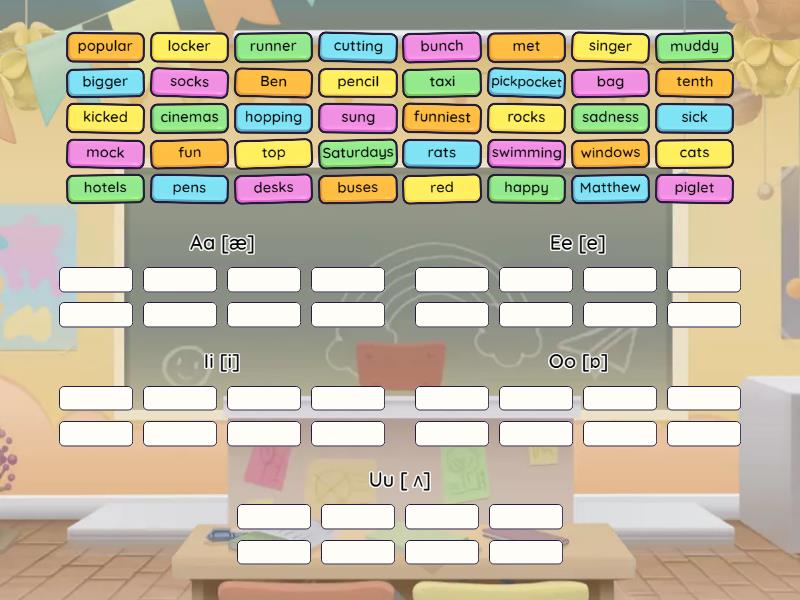 Aa [æ]: cats, sadness, happy, Matthew, bag, taxi, rats, Saturdays, Ee [e]: pens, red, pencil, desks, met, hotels, tenth, Ben, Ii [i]: piglet, bigger, kicked, sick, cinemas, singer, swimming, windows, Oo [ɒ]: socks, pickpocket, mock, rocks, popular, top, locker, hopping, Uu [ ʌ]: buses, bunch, cutting, muddy, runner, sung, fun, funniest,