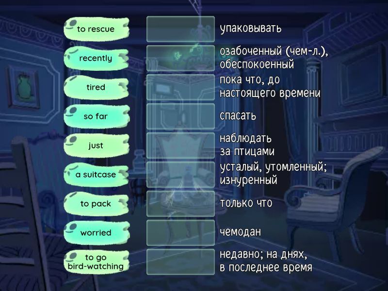 just - только что, to pack - упаковывать, a suitcase - чемодан, to go bird-watching - наблюдать за птицами, so far - пока что, до настоящего времени, to rescue - спасать, recently - недавно; на днях, в последнее время, worried - озабоченный (чем-л.), обеспокоенный, tired - усталый, утомленный; изнуренный,
