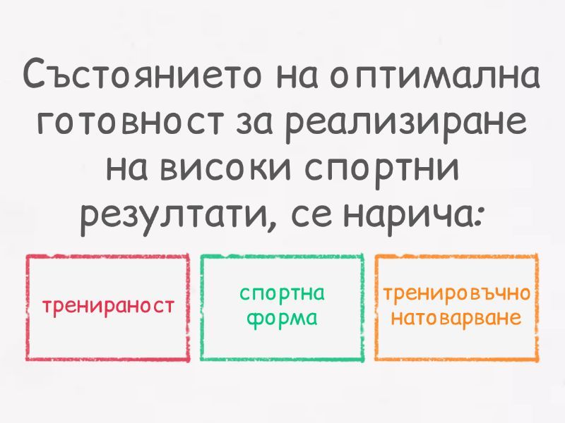 1) Естествена и обективна основа за периодизацията на спортната тренировка представляват: a) екзогенните фактори b) ендогенните фактори c) спортният календар d) фазовият характер в развитието на спортната форма 2) Състоянието на оптимална готовност за реализиране на високи спортни резултати, се нарича: a) тренираност b) спортна форма c) тренировъчно натоварване 3) Трите периода в годишния цикъл са: (Отбележете грешния отговор!) a) подготвителен b) тонизиращ c) състезателен d) преходен 4) Тези закономерни, периодични промени, които настъпват в структурата и съдържанието на тренировъчния процес в границите на определен цикъл, за всеки нов етап на спортната подготовка, представлява: a) периодизация на спортната тренировка b) спортен календар 5) Макроструктурата обхваща: a) големите цикли b) средните цикли c) малките цикли 6) Мезоструктурата обхваща: a) големите цикли на тренировъчния процес b) средните цикли на тренировъчния процес c) малките цикли на тренировъчния процес 7) Посочете каква е стандартната продължителност на един мезоцикъл: a) от 6 до 12 месеца b) от 20 до 40 дни c) от 4 до 10 дни 8) Посочете каква е стандартната продължителност на един микроцикъл: a) от 20 до 100 дни b) от 4 до 10 дни c) от 30 до 60 дни