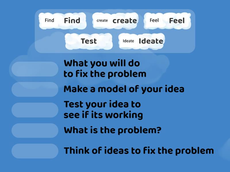 Feel - What is the problem?, Find - What you will do to fix the problem, Ideate - Think of ideas to fix the problem, create - Make a model of your idea, Test - Test your idea to see if its working,
