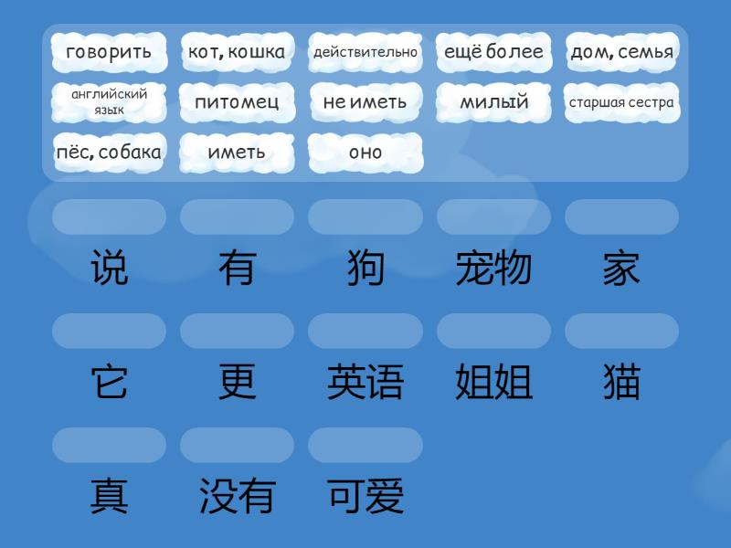 дом, семья - 家, не иметь - 没有, иметь - 有, кот, кошка - 猫, оно - 它, действительно - 真, милый - 可爱, старшая сестра - 姐姐, говорить - 说, английский язык - 英语, ещё более - 更, питомец - 宠物, пёс, собака - 狗,