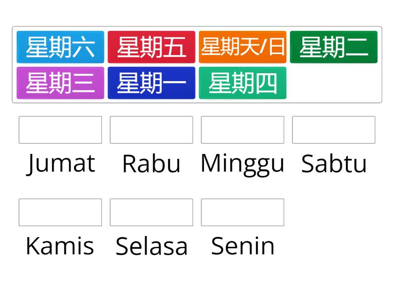 星期一 - Senin, 星期二 - Selasa, 星期三 - Rabu, 星期四 - Kamis, 星期五 - Jumat, 星期六 - Sabtu, 星期天/日 - Minggu,