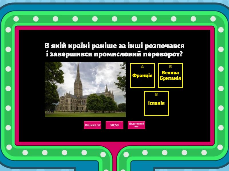 1) В якій країні раніше за інші розпочався і завершився промисловий переворот? a) Франція b) Велика Британія c) Іспанія 2) Які нагороди мала Велика Британія в ІІ половині 19 ст.? a) "майстерня світу", "світовий перевізник", "світовий банкір" b) "імпортер машин", "топ - вугілля" c) "світовий банкір", "фунт стерлінгів століття" 3) Форма монархії Британії a) республіка b) абсолютна монархія c) парламентська монархія 4) Що таке "вікторіанська епоха"? a) період вільної торгівлі b) період правління королеви Вікторії, якй мав певні характерні риси c) період світового лідерства Британії 5) Які дві партії існували в ІІ половині 19 століття? a) торі та віги b) Ліберальна та Лейбористська c) Консервативна та Ліберальна 6) Коли відбулась ІІ парламентська реформа? a) 1687 b) 1832 c) 1867 7) Чи збільшилась кількість виборців внаслідок Другої парламентської реформи? a) так b) ні c) залишилась такою, як і в Першу реформу 8) Який основний наслідок другої парламентської реформи? a) поява нової партії - Лейбористська b) подальша демократизація суспільства c) активізація руху чартистів 9) Продовжіть речення: "У 1801 році були ліквідовані залишки автономії..." a) Шотландії b) Уельсу c) Ірландії 10) До чого призвела відміна "хлібних законів" і хвороби картоплі в Ірландії? a) до економічного зростання b) до голоду 1845 - 1849 рр. c) до занепаду торгівлі 11) Що таке "домініон"? a) те ж саме, що й колонія b) фактично незалежна держава у складі Британської імперії c) назва колоніальних війн, які вела Британська імперія