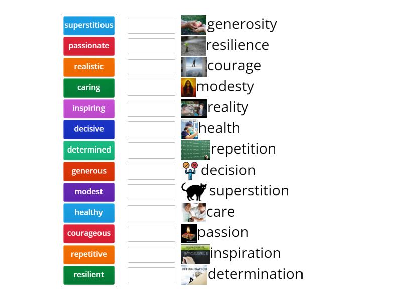 caring - care, courageous - courage, generous - generosity, determined - determination, healthy - health, modest - modesty, realistic - reality, passionate - passion, inspiring - inspiration, decisive - decision, repetitive - repetition, resilient - resilience, superstitious - superstition,