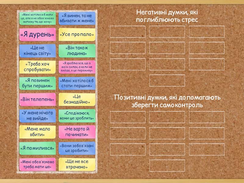Негативні думки, які поглиблюють стрес: «У мене нічого не вийде», «Усе пропало», «Я дурень», «Він телепень», «Мене мало вбити», «Мені обов’язково треба мати це», «Я повинен бути першим», «Вони зобов’язані це зробити», «Це безнадійно», «Не варто й починати», Позитивні думки, які допомагають зберегти самоконтроль: «Я зроблю все, що в моїх силах, а коли не вийде, я це переживу», «Це не кінець світу», «Я помилився», «Він також людина», «Я винен, та не вбивати ж мене», «Мені хотілося б мати це, але я не обов’язково матиму те, що хочу», «Мені хотілося б стати першим», «Сподіваюся, вони це зроблять», «Ще не все втрачено», «Треба хоч спробувати»,