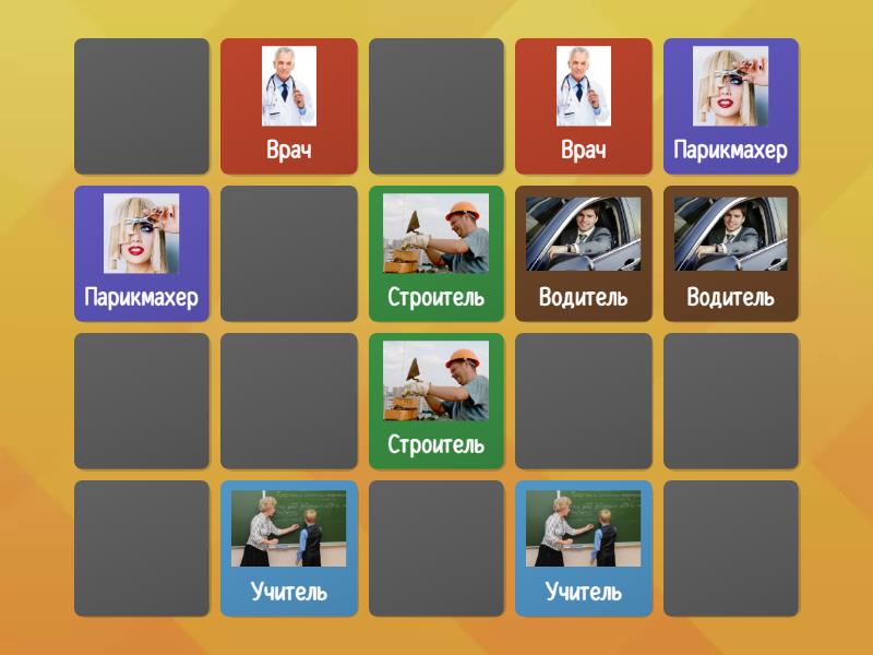 Строитель, Парикмахер, Врач, Учитель, Водитель, Машинист, Пилот, Капитан, Воспитатель, Продавец,