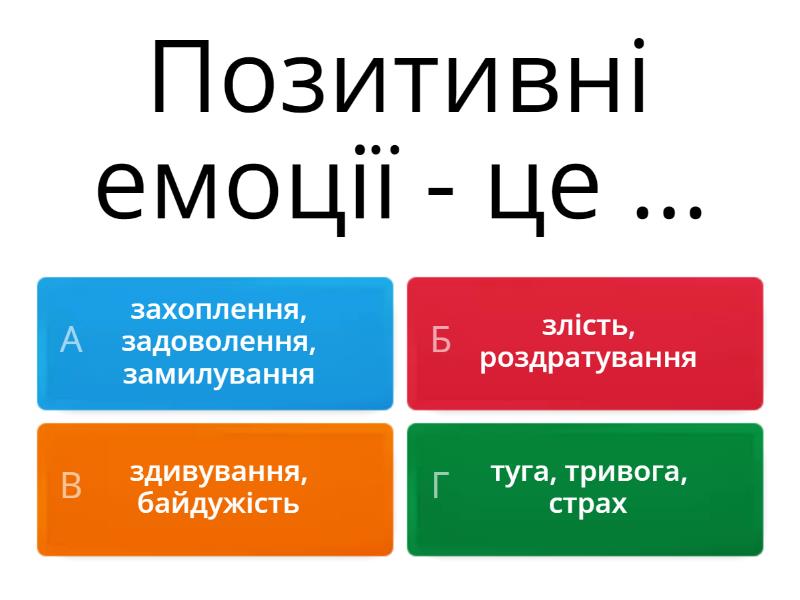 1) Позитивні емоції - це ... a) захоплення, задоволення, замилування b) злість, роздратування c) здивування, байдужість d) туга, тривога, страх 2) Емпатія - це ... a) здатність розуміти емоційний стан іншої людини та співпереживати їй. b) упереджене, негативне ставлення до окремої людини чи групи людей, пов'язане з наявністю у неї/них якихось особливих властивостей чи ознак. c) Позитивна оцінка об'єкта, явища (радість, любов, захоплення тощо) 3) Радість, захоплення, хвилювання, гнів, смуток, страх, подив, сором - це ... a) Почуття b) Емоції c) Емпатія 4) Повага, провина, любов, задоволення, щастя - це ... a) почуття b) емоції 5) Загальний емоційний стан людини - це ... a) настрій b) характер c) почуття d) емоції 6) Яку емоцію передає зображення? a) Тривога b) Радість c) Злість d) Захоплення 7) Оберіть із запропонованого переліку все, що характеризує позитивні емоції (3 відповіді) a) виникають у людини тоді, коли предмети чи явища задовольняють її потреби. b) є ключем до успіху. c) погано впливають на стосунки з оточуючими, на настрій і здоров’я людини. d) виникають через невдачі та брак інформації про проблему. e) спонукають людину до діяльності й досягнення гарного результату. f) можуть навіть погіршувати фізичний стан людини. 8) Оберіть із запропонованого переліку все, що характеризує щасливих людей (3 відповіді) a) проявляють постійне незадоволення середовищем та оточенням. b) замкнуті, сердиті, нещирі. c) досягають успіхів у навчанні та професійному зростанні. d) краще справляються зі стресом, у них міцніше здоров’я, вони довше живуть. e) є більш товариськими і щедрими. f) мають поганий настрій та фізичний стан. 9) Як подолати вплив негативних емоцій на душевне і фізичне здоров’я? (3 відповіді) a) необхідно уникати самотності. b) більше спілкуватися з природою та друзями. c) менше виходити на природу. d) менше рухатися та нічого не робити. e) уникати спілкування з людьми. f) займатися спортом. 10) Оберіть із запропонованого переліку прислів'я про роль негативних емоцій (3 відповіді) a) Заздрість здоров'я їсть. b) Журба здоров'я відбирає. c) Весела думка - половина здоров'я. d) Веселий сміх додає здоров'я. e) Скрипливе дерево довго не живе.