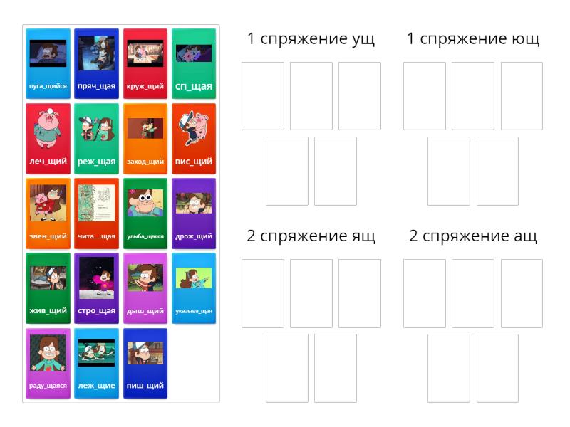 1 спряжение ущ: реж_щая, жив_щий, пиш_щий, пряч_щая, 1 спряжение ющ: чита....щая, раду_щаяся, улыба_щаяся, пуга_щийся, указыва_щая, 2 спряжение ящ: заход_щий, стро_щая, сп_щая, вис_щий, звен_щий, 2 спряжение ащ: леж_щие, леч_щий, дрож_щий, дыш_щий, круж_щий,