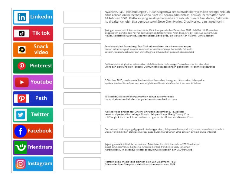 Facebook - Pendirinya Mark Zuckerberg. Tapi Zuck tak sendirian, dia dibantu oleh empat teman sekamarnya di asrama kampus Harvard tempatnya berkuliah, Eduardo Saverin, Dustin Moskovitz, dan Chris Hughes, diluncurkan pada 4 Februari 2004, Instagram - 6 Oktober 2010, media sosial berbasis foto dan video, Instagram diluncurkan. Merupakan aplikasi buatan Kevin Systrom, seorang lulusan Universitas Stanford berusia 27 tahun, Linkedin - Jaringan sosial untuk komunitas bisnis, Didirikan pada bulan Desember 2002 oleh Reid Hoffman dan anggota tim pendiri dari PayPal dan Socialnet(dot)com yakni Allen Blue, Eric Ly, Jean-Luc Vaillant, Lee Hower, Konstantin Guericke, Stephen Beitzel, David Eves, Ian McNish, Yan Pujante, Chris Saccheri, Twitter - Dari sebuah diskusi yang digagas & diselenggarakan oleh perusahaan podcast, nama perusahaan tersebut Odeo. Yang didirikan oleh Jack Dorsey pada bulan Maret tahun 2006 setelah dirilis di dunia internet, Pinterest - Platform sosial media yang didirikan oleh Ben Silbermann, Paul Sciarra dan Evan Sharp ini sudah diluncurkan sejak tahun 2009, Youtube - Nyalakan, (lalu) jalin hubungan". Itulah slogannya ketika masih diproyeksikan sebagai sebuah situs kencan online berbasis video. Saat itu, secara administrasi aplikasi ini terdaftar pada 14 Februari 2005. Platform yang awalnya bermarkas di sebuah ruko di San Mateo, California itu didaftarkan oleh tiga pemuda yakni Steve Chen Hurley, Chad Hurley, dan Jawed Karim, Friendsters - Jejaring sosial ini dikelola perusahaan Friendster Inc. didirikan tahun 2002 berkantor pusat di Silicon Valley, California, Amerika Serikat. Pendirinya yaitu Jonathan Abrams,beliau ini sekaligus kreator sebelumnya dia pendiri dan CEO HotLinks, Path - 18 oktober2018 resmi mengumumkan bahwa customer tidak dapat di akses kembali dan menyarankan tuk memback up data, Tik tok - Aplikasi video singkat asal Cina ini lahir pada September 2016, aplikasi tersebut diperkenalkan sebagai Douyin oleh pendirinya Zhang Yiming. Pria asli Tiongkok tersebut lulusan software engineer dari Universitas Nankai, Cina., Snack video - Aplikasi video singkat ini diluncurkan oleh Kuaishou Technology. Perusahaan ini berakar dari China dan didukung oleh Tencent. Diumumkan sebagai saingan global dari TikTok milik ByteDance,