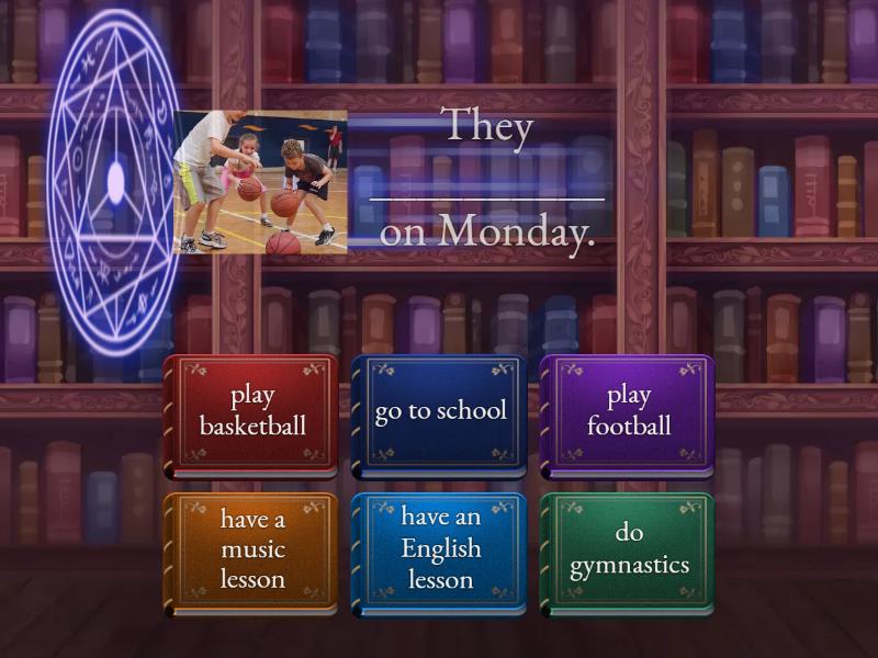 play basketball - They __________ on Monday., do gymnastics - I __________ on Sunday., have a music lesson - I ________ on Friday and Saturday., go to school - They __________ from Monday to Friday., have an English lesson - We ___________ online., play football - They _________ in the park.,