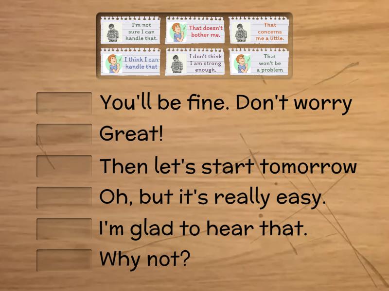 That won't be a problem - I'm glad to hear that. , I'm not sure I can handle that. - Oh, but it's really easy., I don't think I am strong enough.  - Why not?, That doesn't bother me. - Then let's start tomorrow, I think I can handle that - Great!, That concerns me  a little. - You'll be fine. Don't worry,