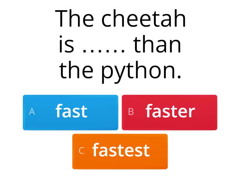 1) The cheetah is …… than the python. a) fast b) faster c) fastest 2) The python is ……… than the lizard. a) longer b) long c) longest 3) The cheetah is …… than the lizard. a) tall b) tallest c) taller 4) My sister is…… than me. a) older b) oldest c) old 5) Bears are ……. than mice. a) biggest b) bigger c) bigg 6) I'm …… at Maths than George. a) worst b) worse c) bad 7) He's got ……. hair than me! a) longer b) long c) longest 8) The cheetah is …….. than the hippo, a) fastest b) fast c) faster 9) The giraffe is …… than the hippo. a) tallest b) taller c) tall 10) Mary is …….. than her mother. a) shorter b) short c) shortest 11) My baby brother is …… than me. a) youngest b) younger c) young 12) A gorilla is ………….. than a tortoise! a) stronger b) strong c) strongest 13) The whale is the …….. of all. a) biggest b) bigger c) big 14) The panda is the …… animal in the park. a) oldest b) older c) old 15) This is the ……. Day of my life! a) good b) best c) better 16) The hippo is the ……. of all. a) biggest b) bigger c) big 17) This is the……………day of my life! a) worst  b) bad c) worse