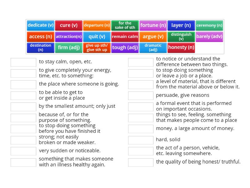access (n) - to be able to get to or get inside a place, argue (v) - persuade, give reasons , attraction(n) - things to see, feeling. something that makes people come to a place, barely (adv) - by the smallest amount; only just, ceremony (n) - a formal event that is performed on important occasions., cure (v) - something that makes someone with an illness healthy again., dedicate (v) - to give completely your energy, time, etc. to something:, departure (n) - the act of a person, vehicle, etc. leaving somewhere., destination (n) - the place where someone is going., distinguish (v) - to notice or understand the difference between two things., dramatic (adj) - very sudden or noticeable., firm (adj) - hard, solid, for the sake of sth - because of, or for the purpose of something., fortune (n) - money. a large amount of money., give up sth/ give sth up - to stop doing something before you have finished it, honesty (n) - the quality of being honest/ truthful., layer (n) - a level of material, that is different from the material above or below it., quit (v) - to stop doing something or leave a job or a place., remain calm - to stay calm, open, etc., tough (adj) - strong; not easily broken or made weaker.,
