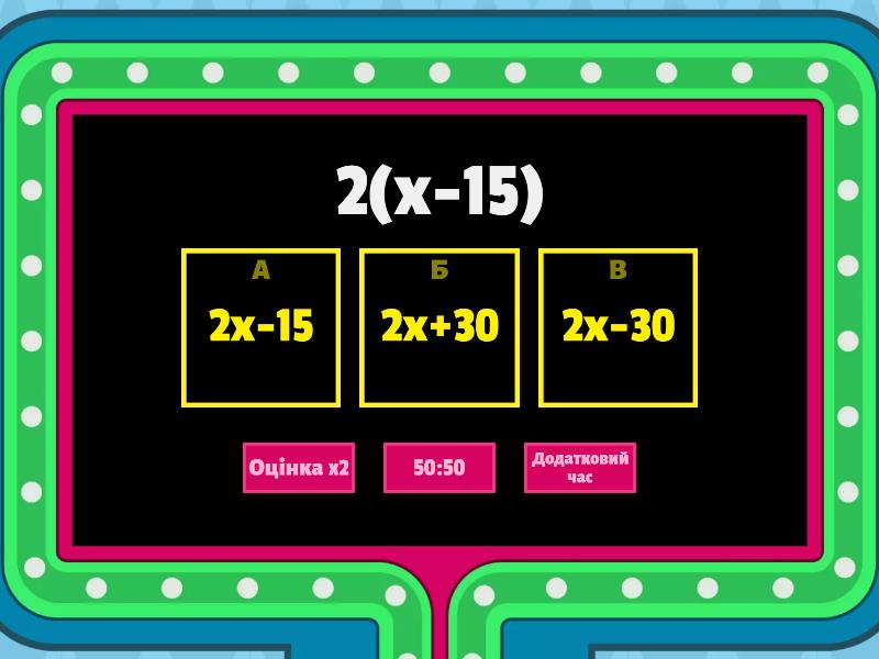 1) 2(х-15) a) 2х-15 b) 2х+30 c) 2х-30 2) -(4a-5b-2) a) 4a-5b-2 b) -4a+5b+2 c) -4a-5b-2 3) 0.9-(m-n) a) 0.9m-n b) 0.9-m-n c) 0.9-m+n 4) -3(a-2) a) -3a-6 b) -3a+6 c) -3a-2 5) -(-c-5-y) a) -c-5-y b) c-5-y c) c+5+y 6) (2x-y)·5 a) 2x-5y b) 10x-5y c) 10x-y