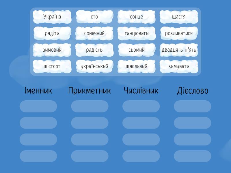 Іменник: сонце, радість, щастя, Україна, Прикметник: сонячний, зимовий, український, щасливий, Числівник: сто, двадцять п’ять, шістсот, сьомий, Дієслово: зимувати, радіти, танцювати, розливатися,