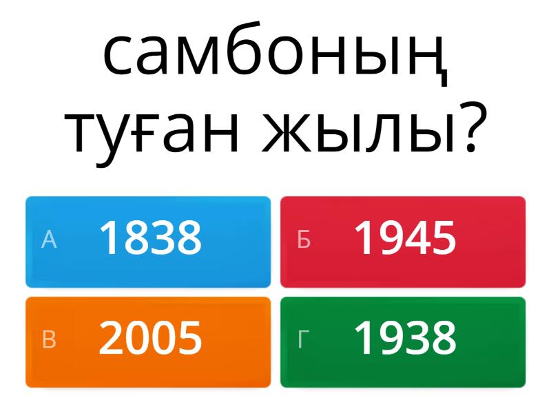 1) самбоның туған жылы? a) 1838 b) 1945 c) 2005 d) 1938 2) Аталған пәндердің қайсысы самбоға жатпайды a) боевойе самбо  b) снежное самбо  c) спортивный самбо d) пляжное самбо 3) ФИАС - қа қанша ұлттық федерация мүше a) 120 b) 90 c) 88 d) 105 4) 2018 жылы әлем чемпионаты қайда өтті? a) Бухарест b) Лондон  c) Сочи d) Италия 5) Самбодан тұңғыш әлем чемпионаты қайда өтті  a) Ресей b)  Испания c) Иран d) Италия 6) Самбоның бойтұмары a) Жолбарыс b) Аю  c) Арыстан d) Барыс 7) ФИФАС қашан GAISF мүшесі болды  a) 1990 b) 1985 c) 1992 d) 1997 8) Самбошылыр Азия ойындарына қай жылы қатысты  a) 2005 b) 2017 c) 2013 d) 2015 e) 2018 9) Универсиадаға самбо қай жылы алғаш рет қатысты a) 2000 b) 2008 c) 2012 d) 2013 e) 2010 10) Самбо қай елде пайда болды  a) Жапония b) Англия  c) Италия d) СССР 11) самбо сөзі қандай мағына береді a) Өзін өзі қорғау b) Қарусыз қорғану c) Қарумен қорғану d) Қорғану 12) Самбоның негізін салушы кім a) В.Ощепков b) В. Морган c) В. Спридонов d) А.Бағдатқызы 13) Самбо техникасы неше  техника тобынан турады a)  3 b) 5 c) 2 d) 1 14) Самбодан жарыстар үшін қанша жас топтары қарастырылған  a) 4 b) 7 c) 8 d) 5 15) Жиырылу уақыты неше минут  a) 2-3 b) 5-10 c) 3-5 d) 15-20 16) Василий Сергеевич Ощепков қай елде білім алған a) Иран b) Ресей c) Токио d) Испания 17) Самбо мен екрін күрестің айырмашылығы a) ережесінде b) киімінде c) кілемшесінде 18) Қай жылы Еуропа чемпионатының тұңғыш ашық біріншілігі басталды a) 1973 b) 1980 c) 1978 d) 1972 19) Бүгінде ФИАС-қа әлемнің қанша мемлекеті мүше. a) 40 b) 5 c) 20 d) 7 20) Самозащита без оружия деген кітап кім жазып шықты a) В.Морган b) В.Конт c) В.А. Спиридонов d) Дж.Нейсмит 21) Самбо қанша елдің ұлттық спорты a) 20 b) 5 c) 8 d) 10 22) Иранның Тегеран қаласында I әлем чемпионатында қай спортшы орын алды a) А.Шор b) Ш.Чанрав c) М.Юнак d) бәрі 23) Самбода кілемшенің өлшемі a) ди.9м b) ди.7м c) ди.5м d) ди.3м 24) Мадрид қаласында әйелдер арасынан бірінші Әлем чемпионаты қай жылы өткізілген a) 1983 b) 1987 c) 1977 d) 1976 25) самбода қауіпсіздік үшін қанша метр кілемше төселеді a) 1.70см b) 1.50см c) 2.00см d) 2.30см 26) Самбода киім үлгісі a) кимоно b) борцовка c) спортивка 27) бірінші шығарылған спортшы қандай түсті бұрышты алады a) көк b) қызыл c) ақ d) қара 28) самбода неше уақыт күреседі a) 4мин b) 3мин c) 6мин d) 10мин 29) самбоның қанша түрі бар a) 5 b) 3 c) 6 d) 4 30) самбо күресіне кайсы жатады a) өзін өзі қорғау b) тебу c) қару қолдану d) ұру