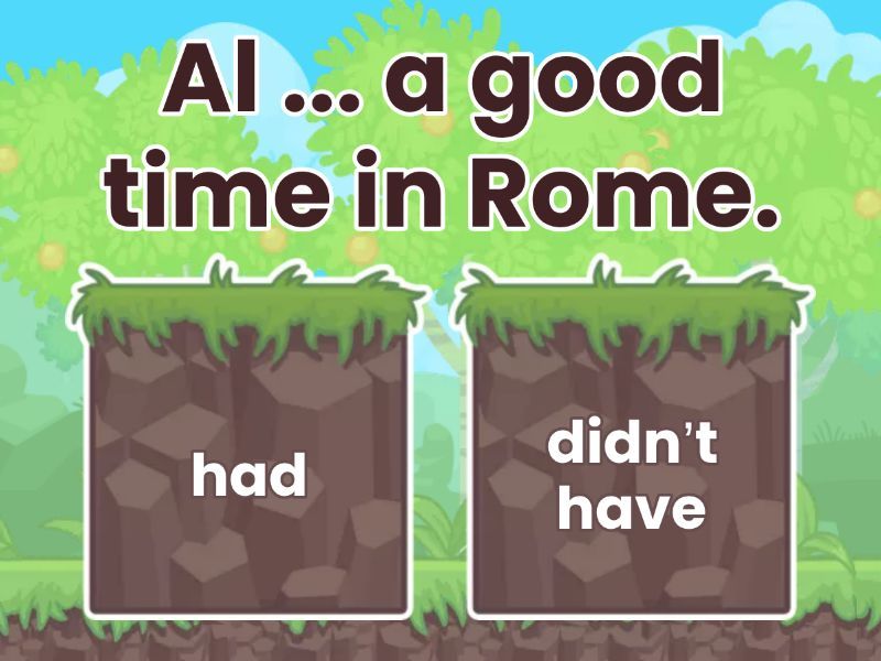 1) Al ... a good time in Rome. a) had b) didn’t have 2) He ... his cousin there. a) met b) didn’t meet 3) He ... places with Sofia. a) visited b) didn’t visit 4) They ... the Colosseum. a) saw b) didn’t see 5) He ... a T-shirt. a) bought b) didn’t buy