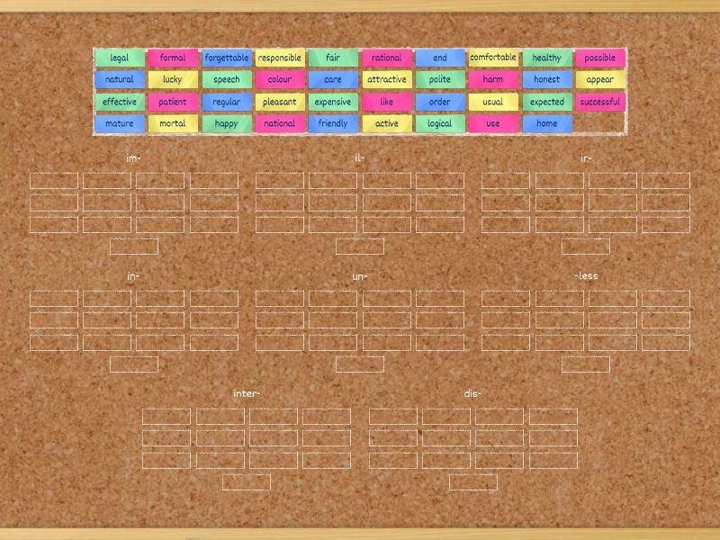 im-: possible, polite, mortal, patient, mature, il-: logical, legal, ir-: responsible, regular, rational, in-: active, effective, expensive, formal, un-: forgettable, successful, attractive, comfortable, expected, fair, friendly, happy, healthy, lucky, natural, pleasant, usual, -less: speech, care, colour, end, harm, home, use, inter-: national, dis-: honest, appear, order, like,