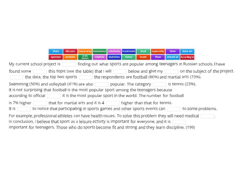 My current school project is ____ finding out what sports are popular among teenagers in Russian schools. I have found some ____ this topic (see the table) that I will ____ below and give my ____ on the subject of the project. ____ the data, the top two sports ____ the respondents are football (80%) and martial arts (73%). Swimming (50%) and volleyball (41%) are also ____ popular. The category ____ is tennis (23%). It is not surprising that football is the most popular sport among the teenagers because according to official ____ it is the most popular sport in the world. The number for football is 7% higher ____ that for martial arts and it is 4 ____ higher than that for tennis. It is ____ to notice that participating in sports games and other sports events can ____ to some problems. For example, professional athletes can have health issues. To solve this problem they will need medical ____. In conclusion, I believe that sport as a leisure activity is important for everyone, and it is ____ important for teenagers. Those who do sports become fit and strong and they learn discipline. (199) The ____ that represents the findings of ____ research in Canada was published online. I ____ it with the purpose to complete my ____ school project, the aim of which is to ____ what Canadian teenagers do not like about their schools. The chart shows that the great ____ of the participants (82%) voted for the category of homework. The rest (18%) said they disliked either boring classes (7%), strict teachers (6%), going too far away (3%) ____ the school cafeteria (2%). The largest ____ of respondents ____ the other subsets by 75% and more. ____, it shows that the majority of the respondents go to schools which offer their students interesting classes, good food in their canteens and the teachers are not too strict. According ____ the statistics, the main problem reported ____ the respondents is the dislike of their homework. To ____ this problem teachers should take it into ____, find the reason and start planning their curriculum according to that. In ____, parents should help their children to manage their time after school. In ____, I think that going to a physical school is very important. It is more ____ emotionally and educationally than studying from ____. (200) This essay is part of my current school project ____ popular ways of travelling in Zetland. In the writing I will discuss some statistical data, which is the results of a survey, and some issues related to the subject of the project. The data (see the table above) has been found on the Internet. According to the ____, travelling by car (40%) is the most popular way of travelling ____ the respondents. It is followed ____ “by train” (29%) and “by bus” (20%). The category of travelling by plane is in fourth place; numerically, it differs ____ the top three categories by 12 points and more. Hitchhiking is not popular ____, with a mere 3% it is the smallest subset in the sample. I think it is not surprising that these two categories are ____ because of the high cost of travelling by plane and the unreliability and insecurity of hitchhiking. Travelling can cause many different problems. For ____, a common issue is ____ or cancelled flights. To ____ the issue, travellers should take an available land ____ of transport such as a train or bus. To ____, it is apparent that people’s favourite ways of travelling ____ and depend ____ various factors. My preferred method of travelling is hitchhiking because it is really adventurous and extremely cheap. ____, as I mentioned ____, it can be unreliable and ____ but if you are well-prepared, cautious and travel with a friend, the journey will be smooth. (245 words)