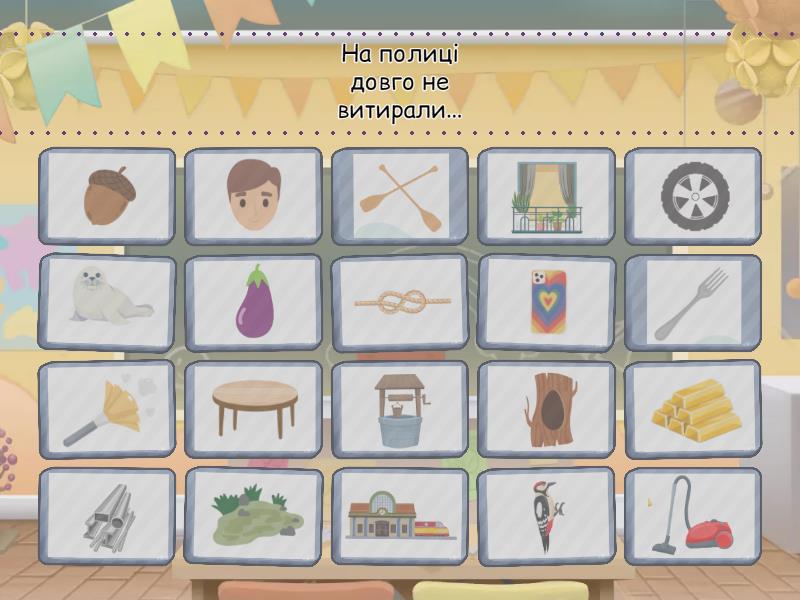 На полиці довго не витирали..., Потяг прибув на..., Ложки і виделки роблять із..., Мотузку зав'язали у..., На телефоні яскравий..., Чотири ніжки має..., Довбе дерево дзьобом..., Жаби люблять..., Щоб прибрати, потрібен..., На кризі відпочиває..., У скрині лежить..., Машині замінили..., На плечах - ..., На дубі з'явився..., Відро опустили в глибокий..., Щоб плисти на човні потрібні..., Котлету їдять..., Сусід вийшов на..., Білка сховалася у..., На городі виросли....,